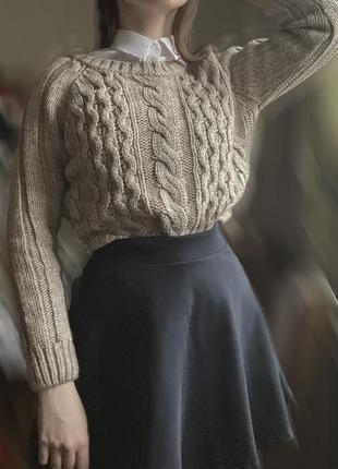 Короткий шерстяной свитер толстой пряжей с простыми узорами. Мягкий и очень тёплый 🤎.