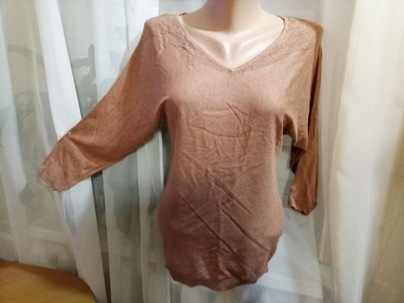 цвет светло коричневый, котон, рукав 3-и четверти, тоненький и мягенький, ращмер 36-38, замеры:рукав от горловины 50,длина64, грудь 44, талия 40