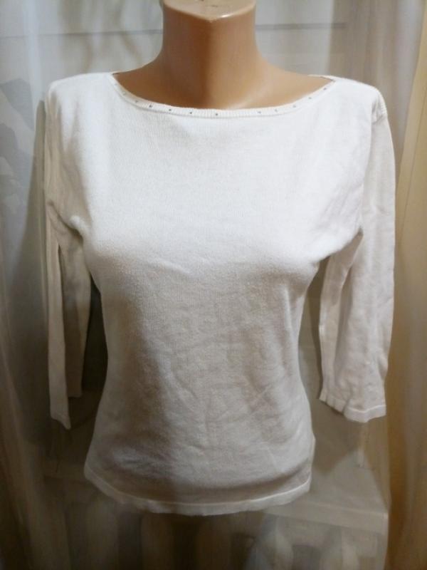 цвет белый, котон, по горловине камушки, рукав ниже локтя, размер 36-38, замеры:плечи 40,длина54, 5, грудт 41, рукав 40, изьяны нужна стирка