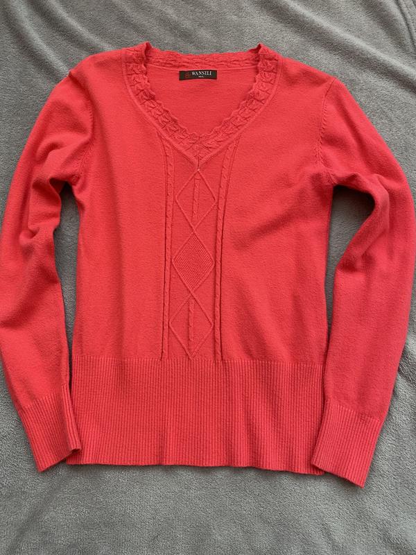 коралловый свитер на бирочка размер м/л очень круто будет сочетаться с рубашкой 😻