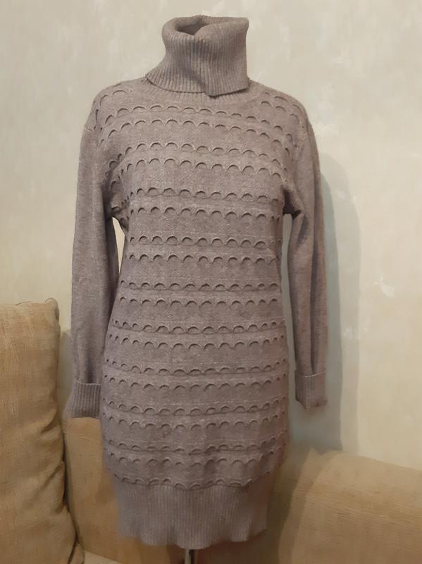 Цікаве плаття/светр з високим коміром (залежить від вашого зростання). Тканина не колеться,приємна до тіла. Цікавий візерунок спереду, спинка гладка. Манжети на рукавах і внизу не розтягнуті,горловина також. Добре тягнеться. Розмір універсальний,від S до XL . На S-ку сяде вільно,на інші р-ри буде щільніше. Під високі чобітки або вузькі джинси буде оооч.класно.