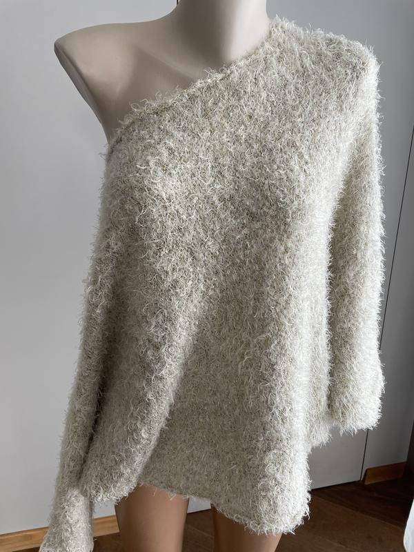 Ассиметричный оверсайз пушистый свитер. Есть небольшое вкрапление люрекса. В отличном состоянии, без дефектов. Размер универсальный.
