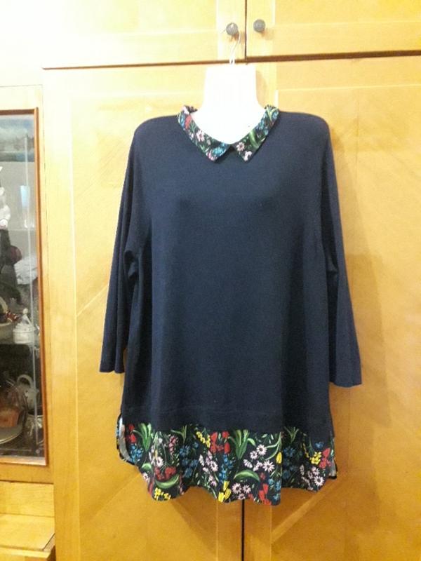 Основной материал вискозный , темно- синего цвета. Воротник и внизу полиэстер с красивым цветочным рисунком. На бирке размер 20. Замеры делали внутри Полуобхват груди сзади 58 см , тянется до 70 см . Полуобхват по талии 58 см. Полуобхват по низу 63 см. Плечи 10 см. Ширина между плечами 40 см. Рукав длина 50 см , бицепс полуобхват 20 см. Высота по спине от плеча у горловины 75 см , от подмышек до разреза 30 см , по переду по середине 69 см , высота вставки внизу 17 см. Застегивается на пуговицу сзади. Камера искажает цвет , основной цвет темно- синий. ❗Доставка Новой или Укрпочтой за счет покупателя. ❗Отправляем после полной оплаты на карточку Приватбанка. ❗Возврата и обмена нет. *1614*
