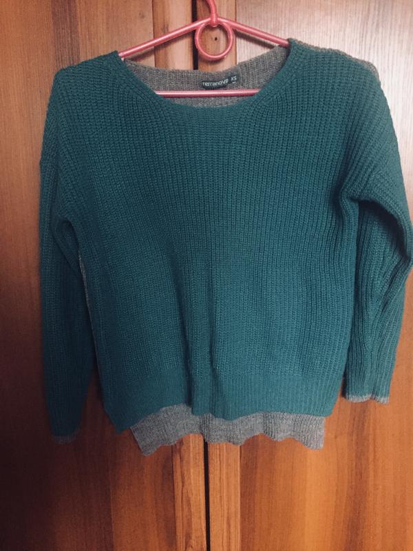 Подовжена кофта, з спереду колір зелений, а заді сірий, розмір с)