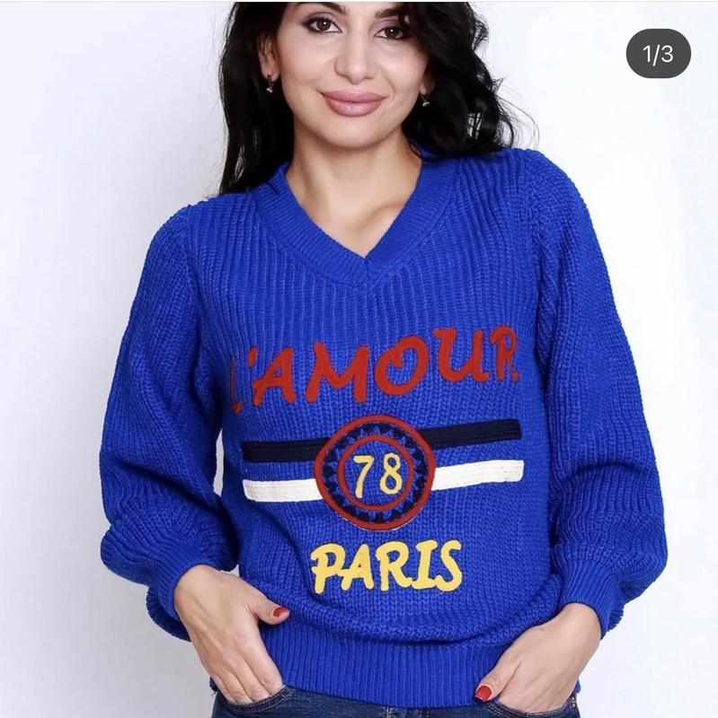 Цвет свитера Електрик с вышивкой в середине надписи. Данная модель изделия выполнена в свободном крое с легка расклешенным рукавом и зауженным к манжету.
