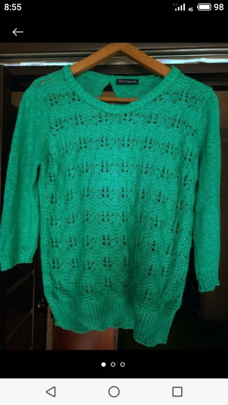 Свитер в очень хорошем состоянии, тонкий, ажурный, хорошо тянется, цвет зеленый Замеры в спокойном состоянии : ОГ 43, Рукав 41, длина 57.
