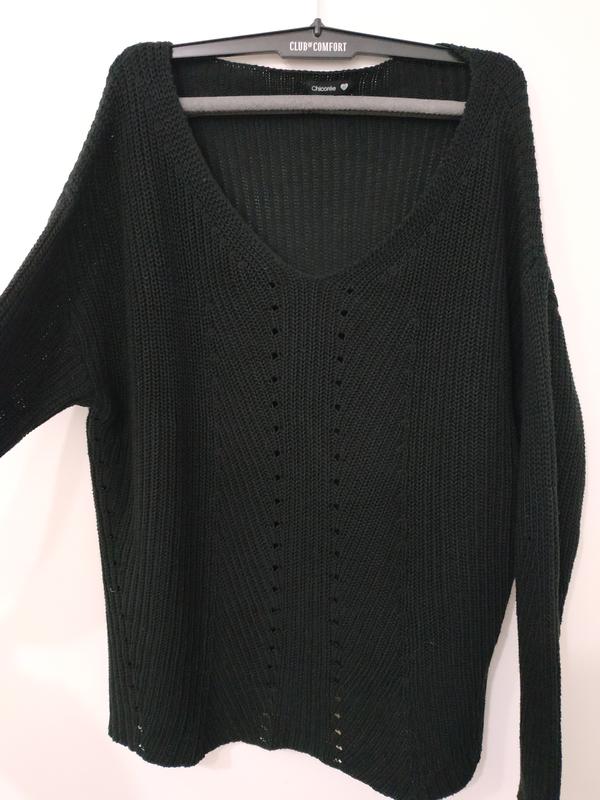 Класний в'язаний чорний светр тонкої в'язки. Розмір xl, але гарно буде виглядати на l, m, як оверсайз. Параметри ПОГ - 56см (тягнеться) Довжина 61см Довжина рукава -57 см