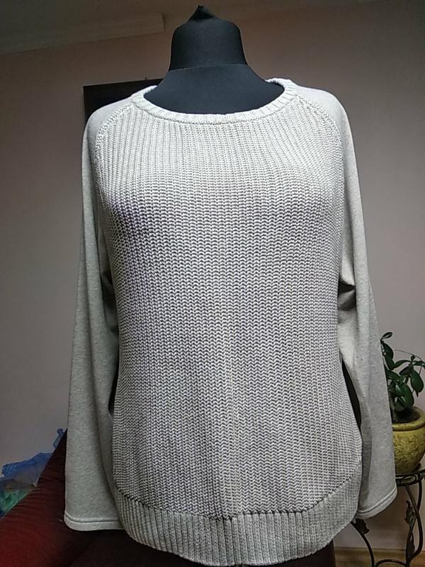 Уютный, мягкий свитерок бежевого цвета. Передняя часть - вязка, рукава и спинка трикотаж внутри фланель. Пог 60,длина 60,рукав из-за кроя считаю от горловины- 75