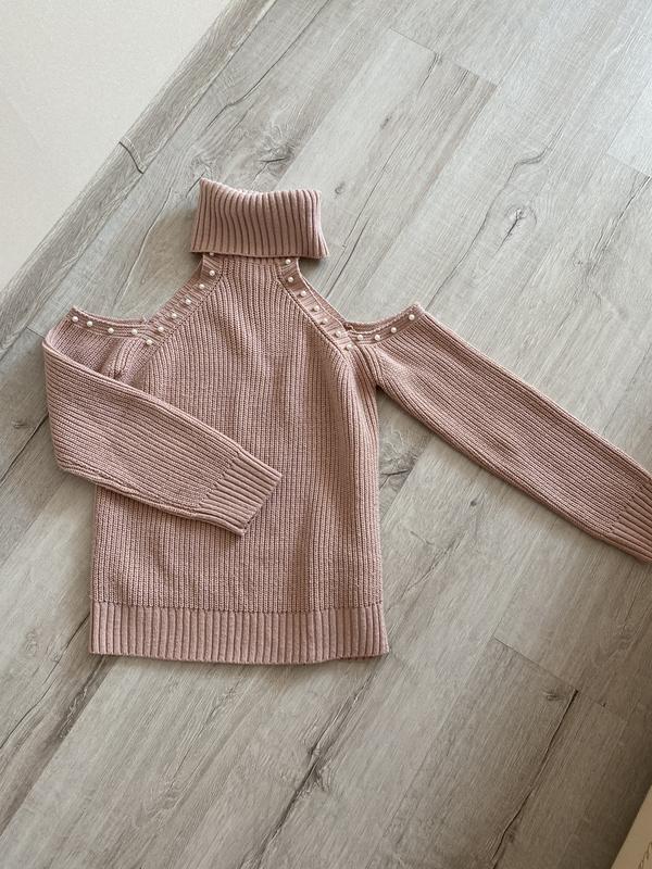 Пудровый свитер с открытыми плечиками , декор жемчуг