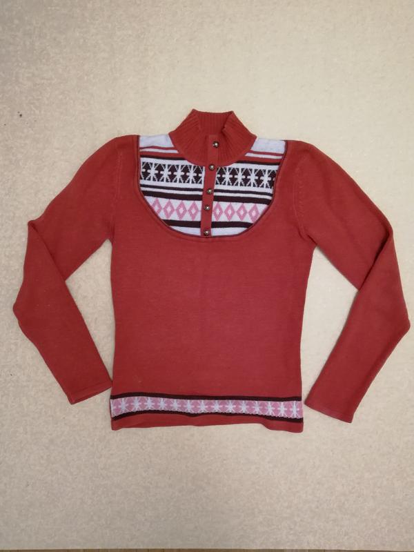 Светр з 60% вовни на складі. Приємний до тіла і з орнаментом. Розмір не вказаний, але підійде на S - M, так як тягнеться.