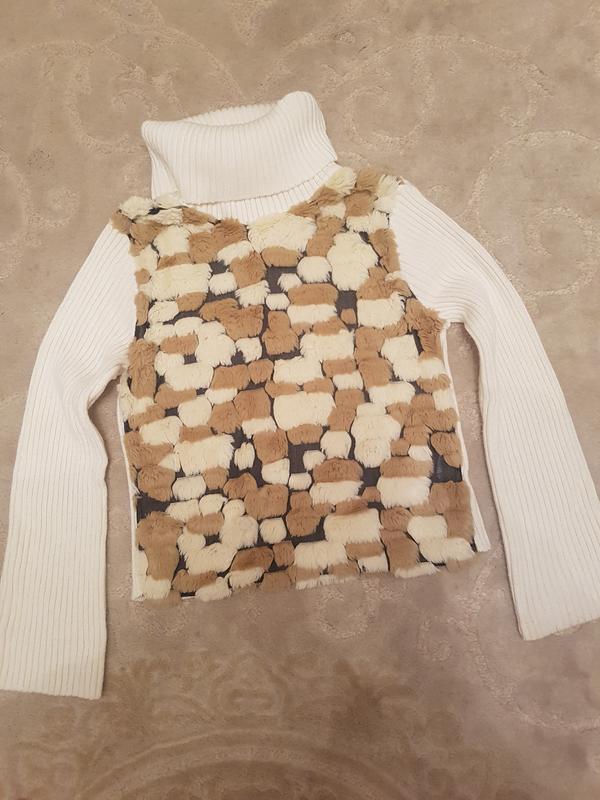 Теплый белый свитер со вставкой исскуственного меха спереди. Спинка чисто белая. Воротник - хомут. Длина от плеча 53 см Плечи 42 см ПО низ 46 см ПО груди 46 см Длина горловины 24 см ПО руки (верх,низ) 22/15 см Длина рукава 60 см