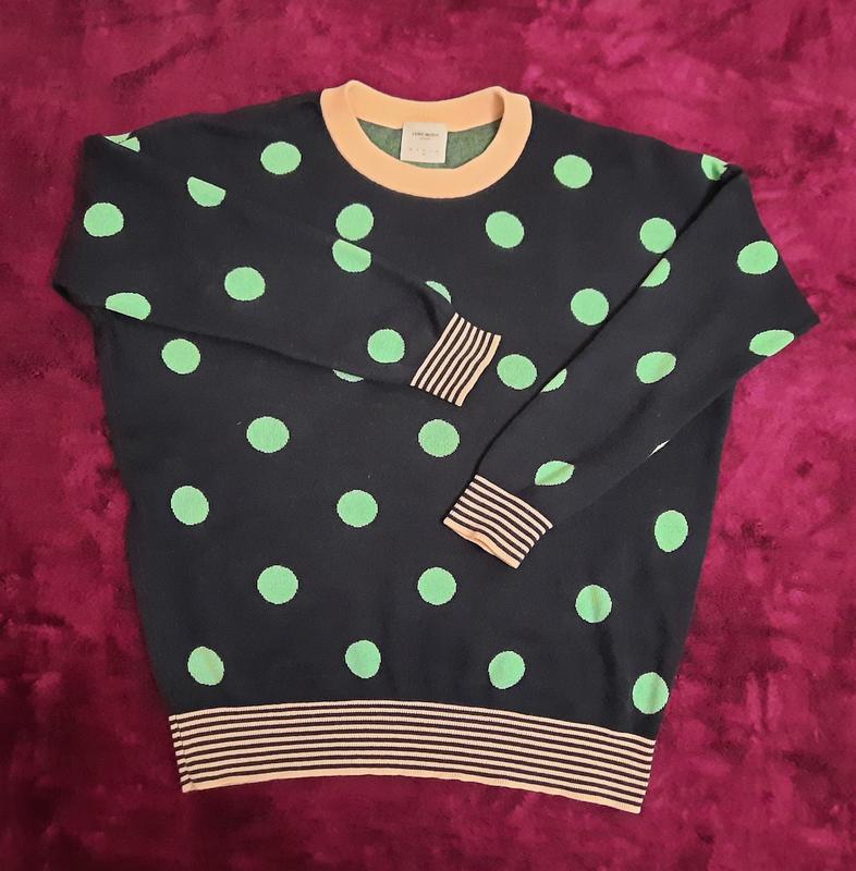 Очень оригинальный и необычный свитерок в зелёные горохи. Горловина, манжеты и резинка внизу пыльно-розового цвета. ПОГ-63 Плечо-27 Рукав (спущенный)-46 Низ(резинка)-42 Длина по спинке-66 Состояние отличное.