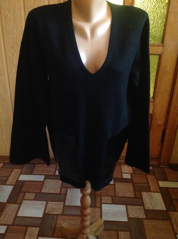 Свитер с карманами из искусственной кожи. Стан отличный, рукав расширен к низу. Выглядит стильно. Приятный к телу. Длина-65, длина рукава от ворота-71, пог-56, окружность низа-57, ширина рукава внизу-42.