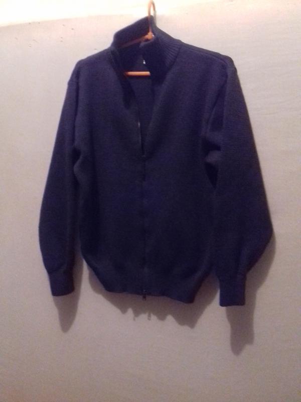 Тёплая плотная кофта свитер на замке.В прекрасном состоянии.Может идти как унисекс.Темно синего цвета.Фасон-как бомбер(не в обтяжку.размер С.длина 60см.рукав-60см.по подмышках 51см.