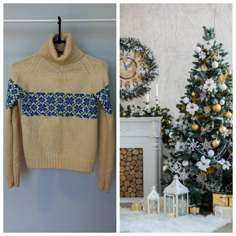 Теплый свитер молочного цвета с голубыми снежинками. Размер S. Длина по спинке 55см. Подойдет на параметры: ОГ не больше 90см ОБ не больше 95см