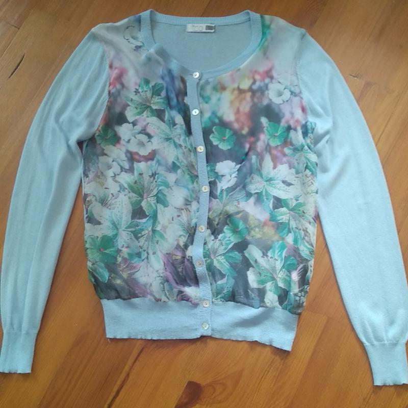 Красива кофтинка на гудзиках, спереду із шифону, рукави і спинка- тонка в'язка. Розмір М/L. Стан відмінний. Додаткові фото і заміри запитуйте в директ 📩