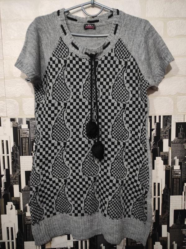 ❀Стильная, теплая туника- платье На горловине тесемка с помпонами ❀Цвета: серый/черный ❀Размер укр.46-48