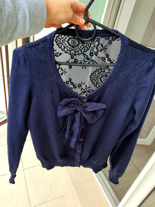 Нарядний светр темно-синій котоновий тоненький спина ажурна. бант можна зняти. довжина кофти 55см рукав 62cm пог 47см розмірМ/L. Стан нової речі.