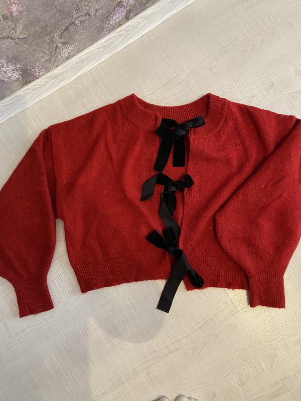 Очень красивый свитер чёрные ленты сзади спина открыта, укороченая модель. Идет как оверсайз