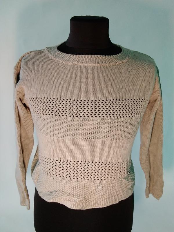 Пог 50, плечи 46, рукав 47/46, длина 46 На кофточке ввязана другого цвета нить. С изнаночной сторлны топорщатся ниточки. Новый, остатки