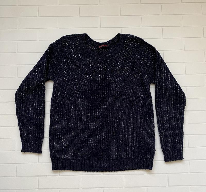 Красивый, тёплый и мягкий темно-синий свитерок с люрексной нитью. На плечах вырезы. Очень круто смотрится! Длина по спинке- 59 см