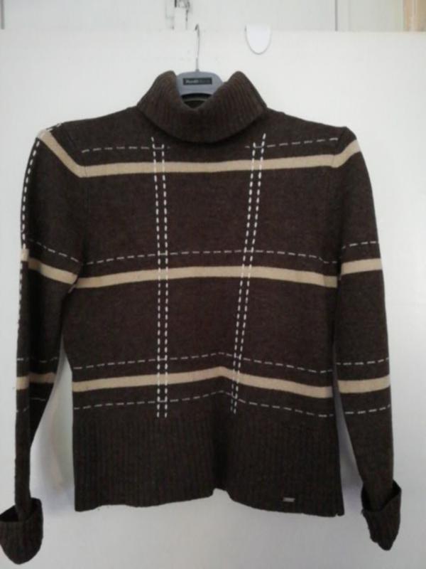 Свитер шоколадного цвета с рисунком. В составе 80% шерсть ягненка и 20%добавка. Длина 56 см Пог 48 см Рукав 63 см