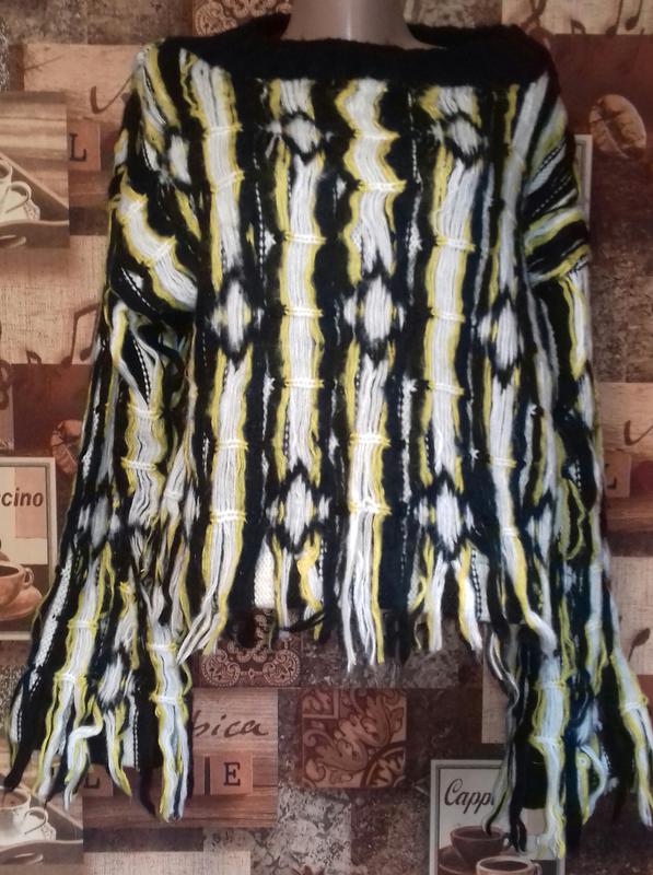 Свитер необычного дизайна SIMPLY Couture,p.S,акрил.Вязаный свитер,сверху навязан еще одтн слой нитей,которые переходят в бахраму.Замеры:пог-61см,пот-58см,низ-58см,рукав-52см+5см бахрома,плечи-58см,длина-50см+5см бахрома.Состояние новое,этикетки нет.