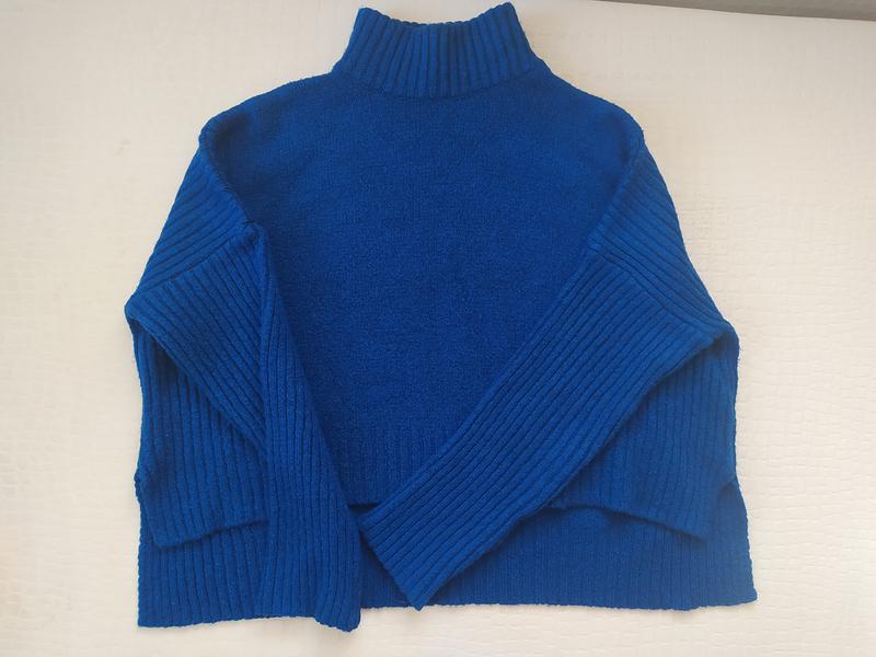 укорочена, широка дуже яскравого, гарного синього кольору, дуже тепла кофта. в носці була, стан хороший, б/в. без дефектів. Туреччина. підійде на xxs-xs, або невисоку s. довжина від плеча спереду 40см, ззаду 49см, ширина під руками 57см.
