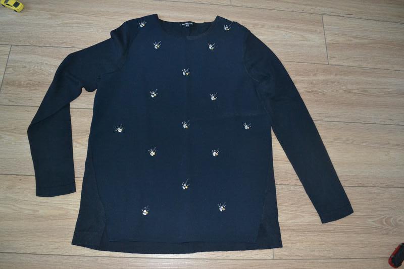 Ошатна кофта оригінально пошита,перед з іншого контрастного матеріалу,дуже стильно виглядає,є нюанс,немає одного каменю,на фото показала,в іншому стан відмінний.Розмір L