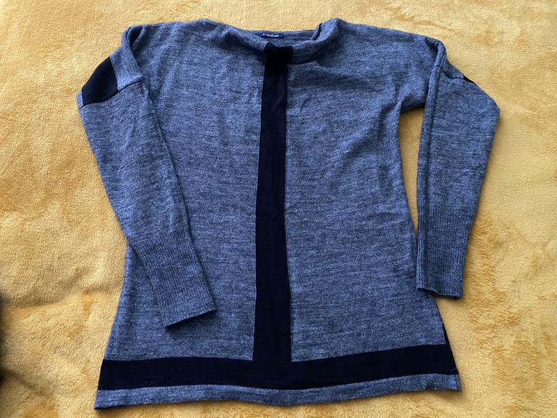 Кофточка интересного кроя со спущенными рукавами, 100% шерсть, но при носке бирку срезала. На ощупь Вы поймете, что там чистая шерсть, очень теплый свитерок, но тоненький, чуть кусается. Цвет черно-серый, спинка в горизонтальную полоску, горловина лодочка, которая спереди переходит в маленькую драпировку. БУ, состояние идеальное.