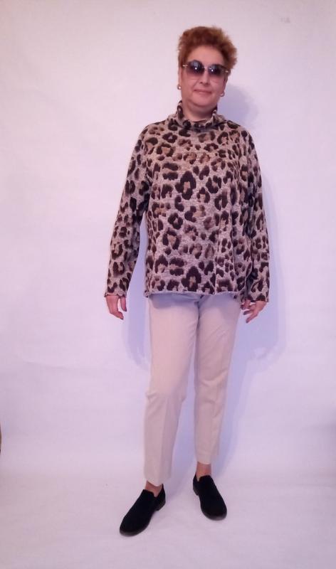 Трикотажный,лёгкий свитерок -туника в леопардовый принт , длинный рукав,воротник высокий фасон трапеция Край низа не обработан состав -полиэстер,маленький начесик Написан размер UK-18 Подойдёт на размеры 50-52-54-56 L-XL-XXL-XXXL /замеры Под мышками -72см ширина переда- 43см плечо 12см Длина рукава -62см длина свитерка 70см Состояние новой вещи😀👍👍👍без нюансов,Сток!!!!