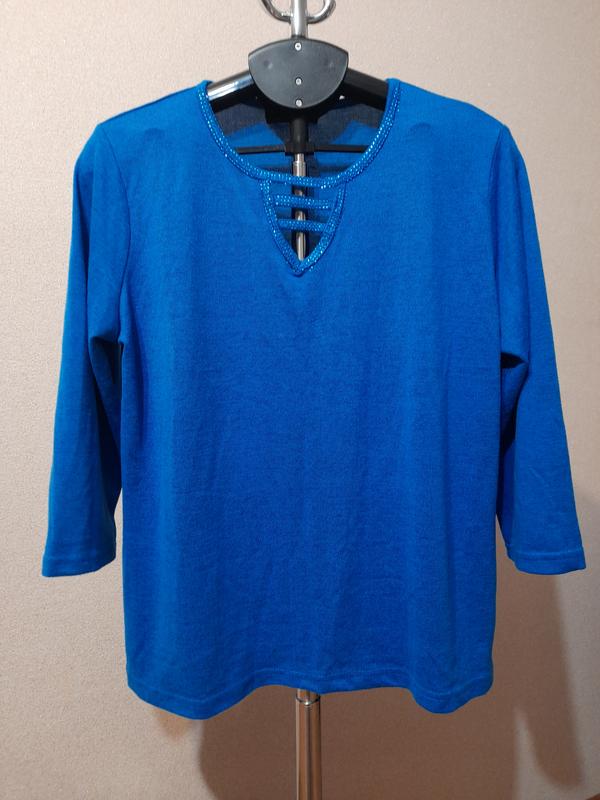 Нова Приятная к телу Рукав 3/4 Есть небольшой брак - наклеенные неровности стразики (видно на фото) Размер XХL/XХXL Замеры: ПОГ 55 СМ ПОТ 56 СМ Длина 62 СМ