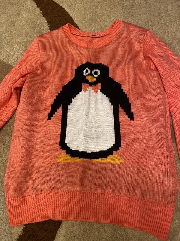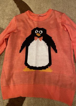 Свитерок с пингвином Кораллового цвета Размер М-Л Турция Цвет однородный одинаковый. Падает тень от телефона фото