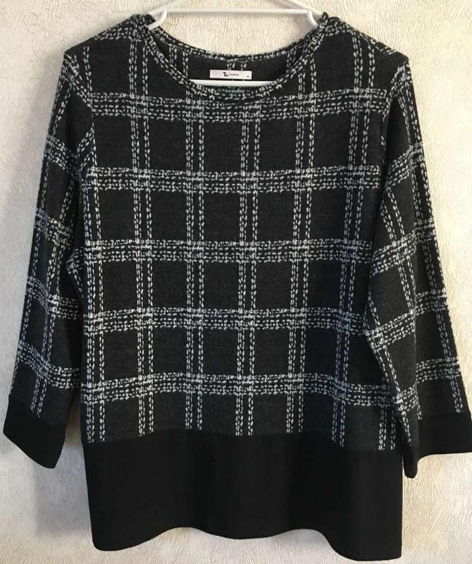 Ткань очень мягкая, создается впечатление, что это вязка. Прямой силуэт. Рукав 3/4. Длина - 63 см, длина рукава - 47 см, ПОГ - 54 см, ПОБ - 54 см Внизу - трикотажная отделка.