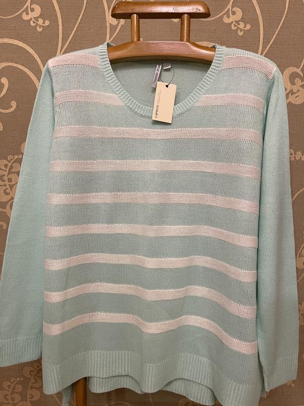 Предлагаю вашему вниманию очень красивый и стильный брендовый вязаный свитер-оверсайз в бело-зелёную полоску (к сожалению фото не передало всю красоту этой вещи..в живую смотрится гораздо интересней и цвет более зелёный и насыщенный). Фирма CAPSULE. Размер указа 18/22, но хорошо будет и на больший размер 22/26. Состав: 100% акрил..нитка очень мягенькая и приятная к телу, хорошо тянется. Новый. ПОГ-70+ещё хорошо тянется, длина-68, по спинке немного длинней-73, плечи-47, длина рукава-65, ширина по низу-73+ещё хорошо тянется. ВНИМАНИЕ!!! При покупке три и более моих вещей-бесплатная доставка посылки Новой почтой. Удачных покупок:)