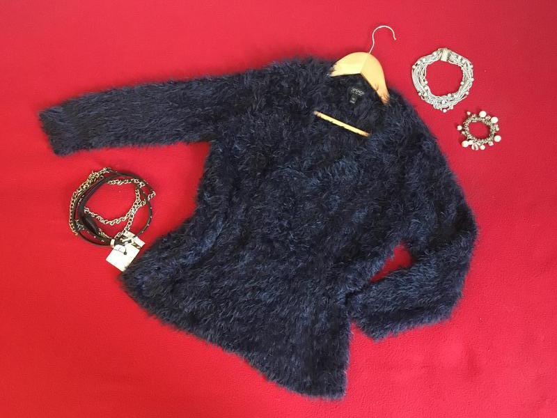 Свитер c длинным ворсом, глубокий V-образный вырез, рукав три четверти. Богатый цвет сапфира будет отлично сочетаться со светлыми брюками или юбкой. Отличное качество. Без бирки. Замеры: длина 59см ширина 49см рукав от плеча 51см