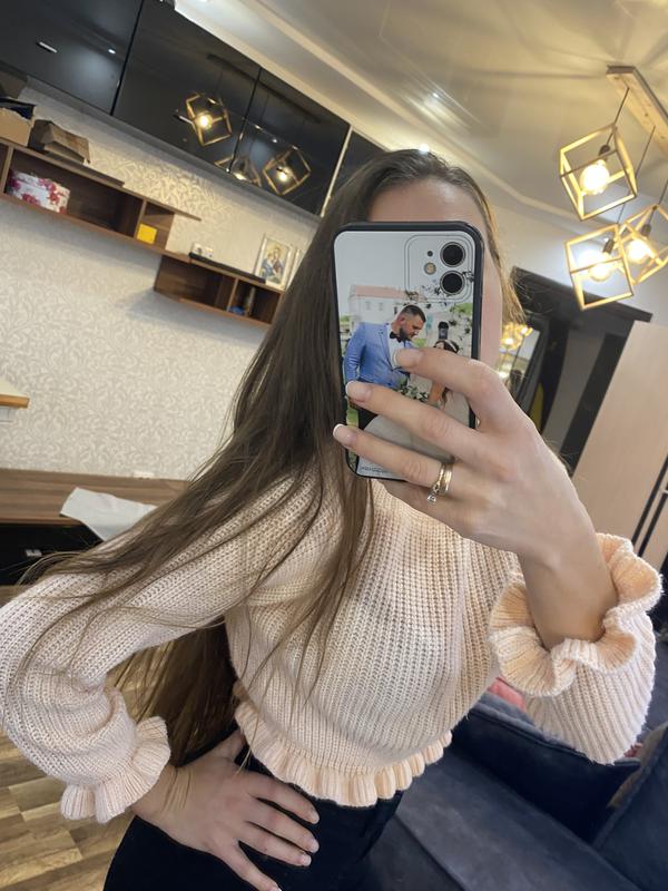 В‘язана кофта з рюшкою до талії під високі джинси чи брюки супер тренд сезону пудра дуже хороший стан є лиш деякі нюанси! Їх майже не видно! Підійде на 160 зріст!