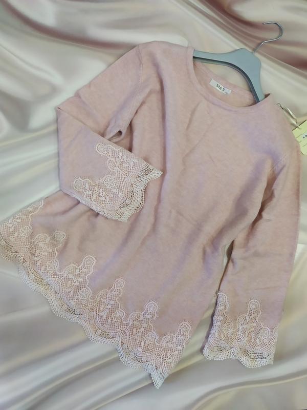 Роскошный удлиненный свитер.Производство Италия.Отличительный состав, мягкий, не колется.Очень красивое вязаное кружево.Колир нежно розовый Пог 55 см. ширина плеч 45 Длина рукава 50+3-5см кружева. Длина 72 см