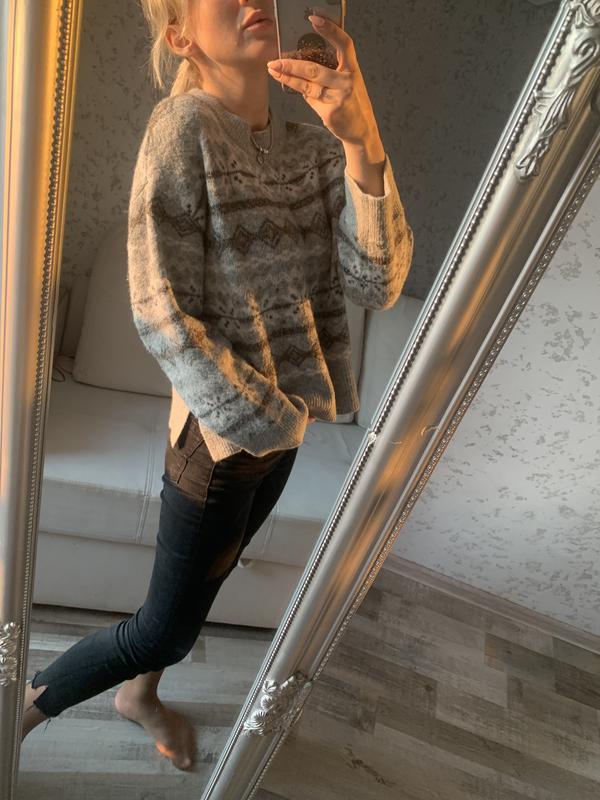 Тёплый свитер с объемными рукавами. По бокам разрезики. Состояние нового. Очень стильно смотрится, присутствует серебристая люрексовая нить. Ткань не кусается, приятная к телу, хоть и есть 3 % шерсть в составе. Носится как оверсайз, размер С.Можно и на М. Параметры: длина 55 см, пог 54 см, рукав от плеча 69 см, по внутреннему шву 40 см