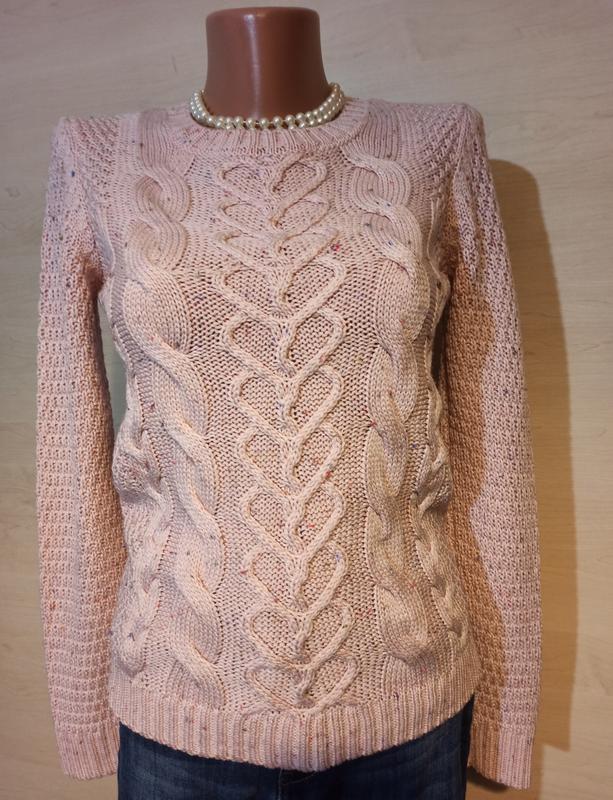 Свитер в косы пудрового цвета ,по бокам маленькие разрезы ,спинка длиннее переда на 4 см . Пог 42 см ,Пот 39 см,По низа 42 см ,длина рукава 62 см ,длина свитера по спинке 62 см ,по переду длина 58 см ,тянется.