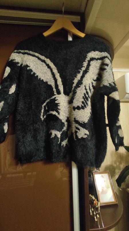 очень оригинальная.Рисунок орел, сзади большой горох. Мягкая,теплая ткань альпака,или как альпак рукав чуть как летучая мышь, выравнивает круто.Длина рукава четыре четверти.