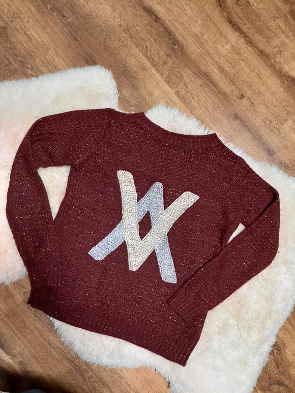 Бордовый приятный свитер с серебряно-золотистой нашивкой.Трикотаж: шерсть 65%, коттон 26%, лайкра10%. Замер: плечи 39см, пог 52см, длина 53см, рукав 65см.
