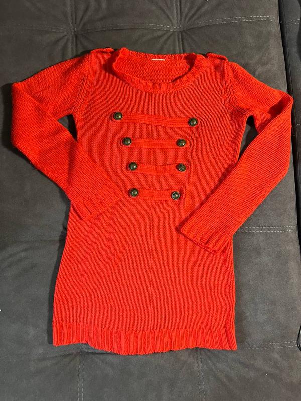 Яркий свитерок красного цвета спереди с пуговичками. Плечо 10,5 см, рукав 67 см, длина 78 см, по груди до 46 см, ширина 44-54 см) Есть немного катушек