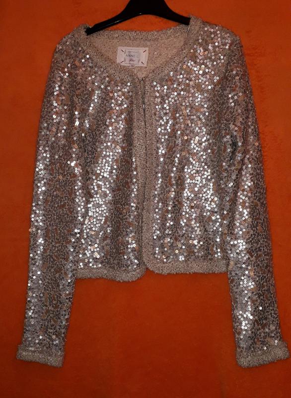 продам очень красивый жакет на крючках с пайетками,пайетки золотого и серебрянного цвета,на фото передать невозможно,в действительности жакет блестит меньше,не такой броский как на фото,оплата на карту приват или наложенный платеж по предоплате на доставку