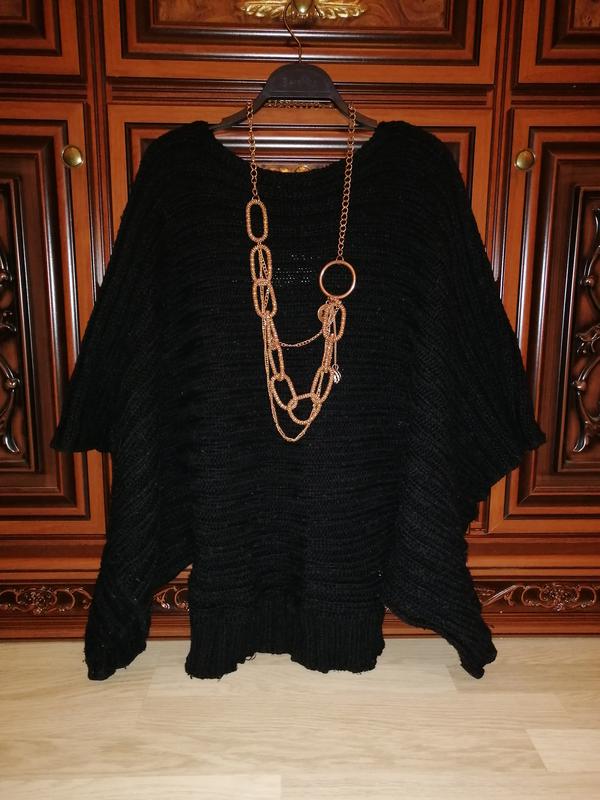 Свитер в очень хорошем состоянии, есть совсем немного, местами катышки. Легко убирается и не видно. Широкие рукава, фасон немного летучая мышь. Ворот- лодочка. По низу широкий манжет. Вязка -резинка, крупная. Модель стройнит. Бирок нет, покупала в terranova, состав похож на акрил, шерсть, может еще полиэстер немного. Замеры: Длина - 70 см Обхват под рукавами по груди- 94 см Низ обхват - 86-94 см Длина по линии рукава -46 см Ширина рукава обхват - 104