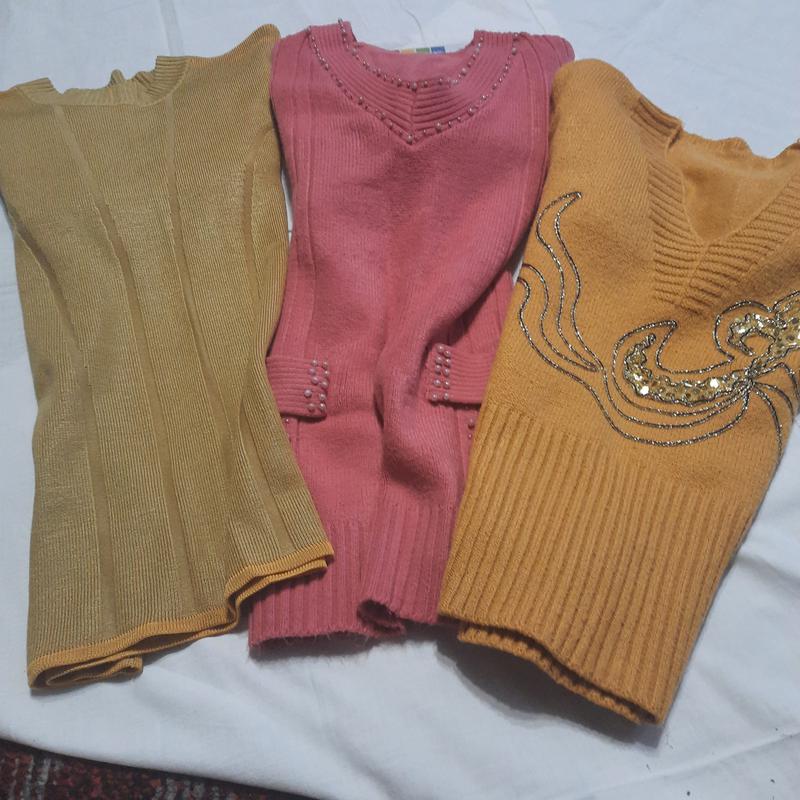 3 светри в хорошому стані: 1. довжина по спинці - 55см, довжина рукава - 54,5см, пог-40 см; 2. спинка - 55см, рукав- 55см, пог-41 см; 3. спинка-51 , рукав-55, пог-40.