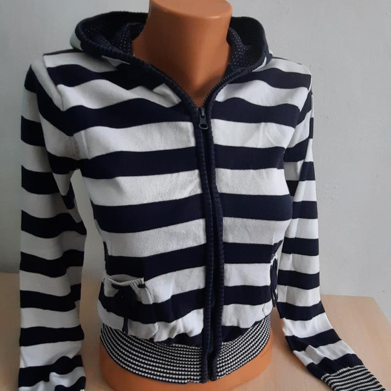 Свитер в полоску для девочки на замочек, с двумя кармашками В идеальном состоянии. Плечи 35 ПОГ 39 Длинна по спинке от шва капюшона 51 Длинна рукава 63