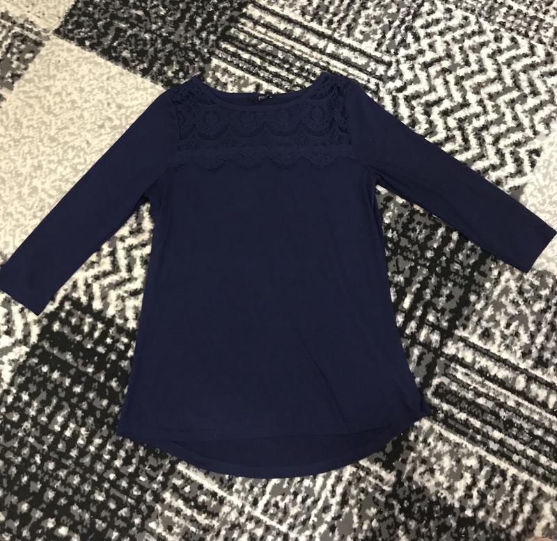 Синя кофточка з мереживом Рукав 3/4 (46 см) Обхват грудей 45 Довжина спереду 62, ззаду 66