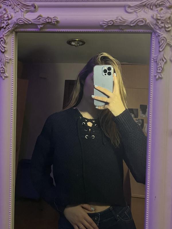 Темно-синий укороченый вязаный свитер на шнуровке. В отличном состоянии!