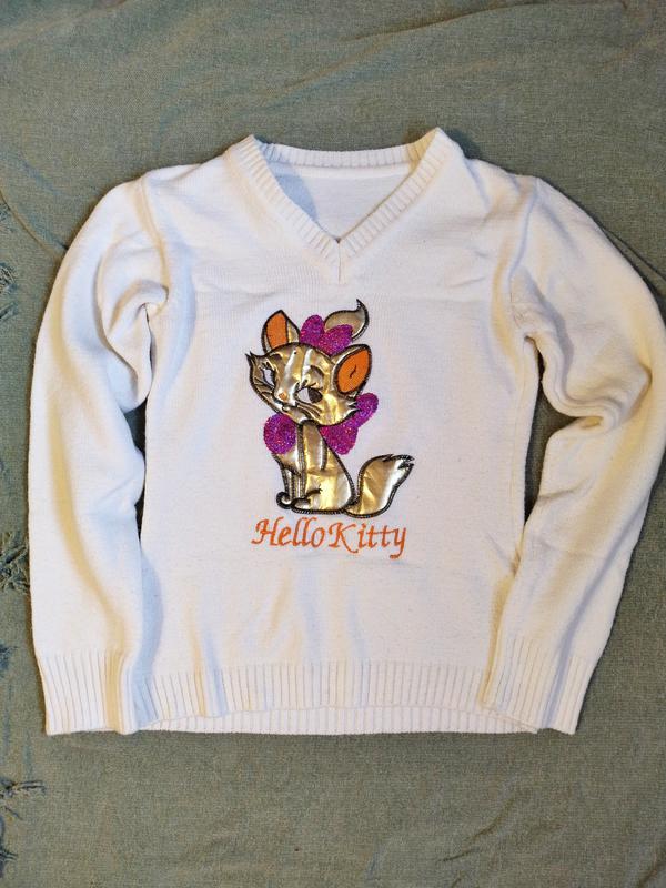 Свитер белый с мультяшным котёнком и надписью hello kitty Длина -59 см Ширина -38 см Длина рукава - 59 см